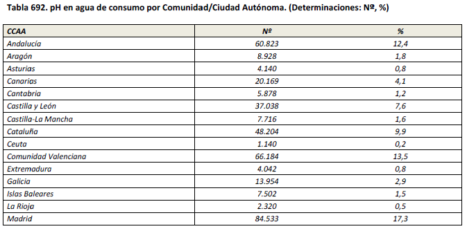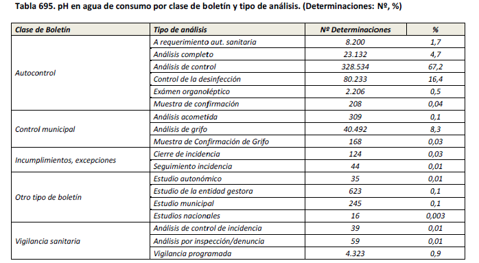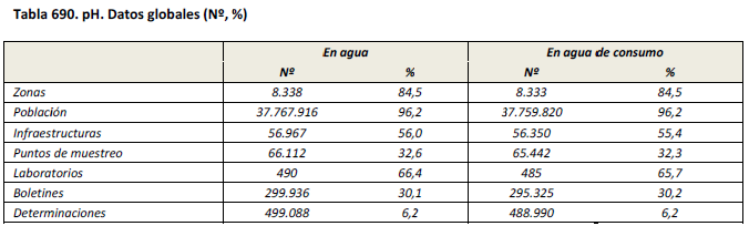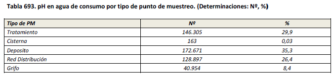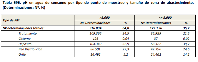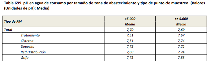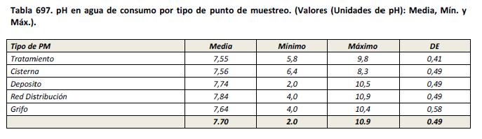 La media del valor cuantificado ha sido 7,70, con un máximo y un mínimo en agua de consumo de 10,9 y 2,0. El Punto de Muestreo donde la media es más alta ha sido en red de distribución con 7,84; en las Zona de Abastecimiento que suministran entre 100 a 1.000 m3/día ha dado la media más alta: 7,8 y por tamaño de Zona de Abastecimiento, en Zona de Abastecimiento >5.000 habs. la media ha sido de 7,70 y en las menores de 5.000 habs. 7,69.
