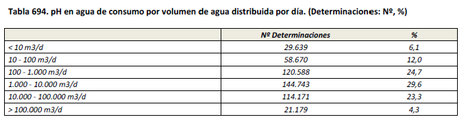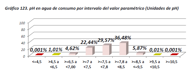 De las 488.990 determinaciones para agua de consumo notificadas en 2016, en el 98,98% proporcionaron valores entre 6,5 y 9,5 Unidades de pH. (Grafico 123 y tabla 700)