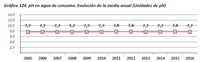 El valor promedio de los valores obtenidos en agua de consumo durante el año 2016 se corresponde con 7,7 unidades de pH, valor que se prácticamente se ha venido manteniendo a lo largo de los años.