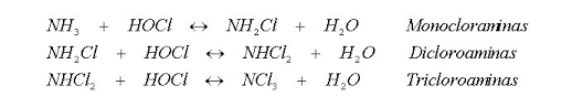 El amonio producido se combina con el cloro presente en el agua, formando productos derivados, conocidos como cloraminas (cloro combinado):