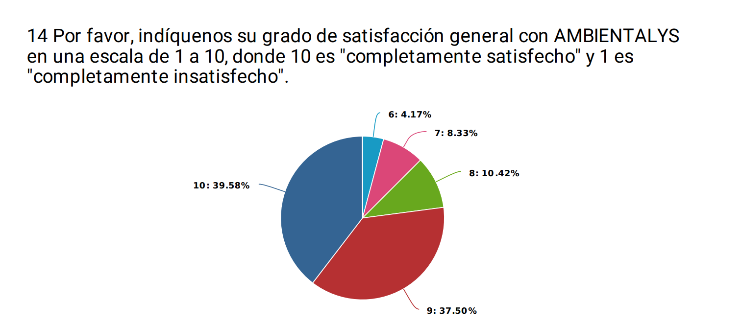Un año más, Ambientalys ha realizado su encuesta de satisfacción a clientes. El trato dado por el personal, el contenido y formato de los informes, la experiencia con la empresa, los plazos de entrega y la asistencia técnica han sido alguno de los indicadores testados en esta encuesta. El objetivo del informe es, por tanto, conocer el nivel de satisfacción de nuestros clientes con nuestra filosofía y método de trabajo.